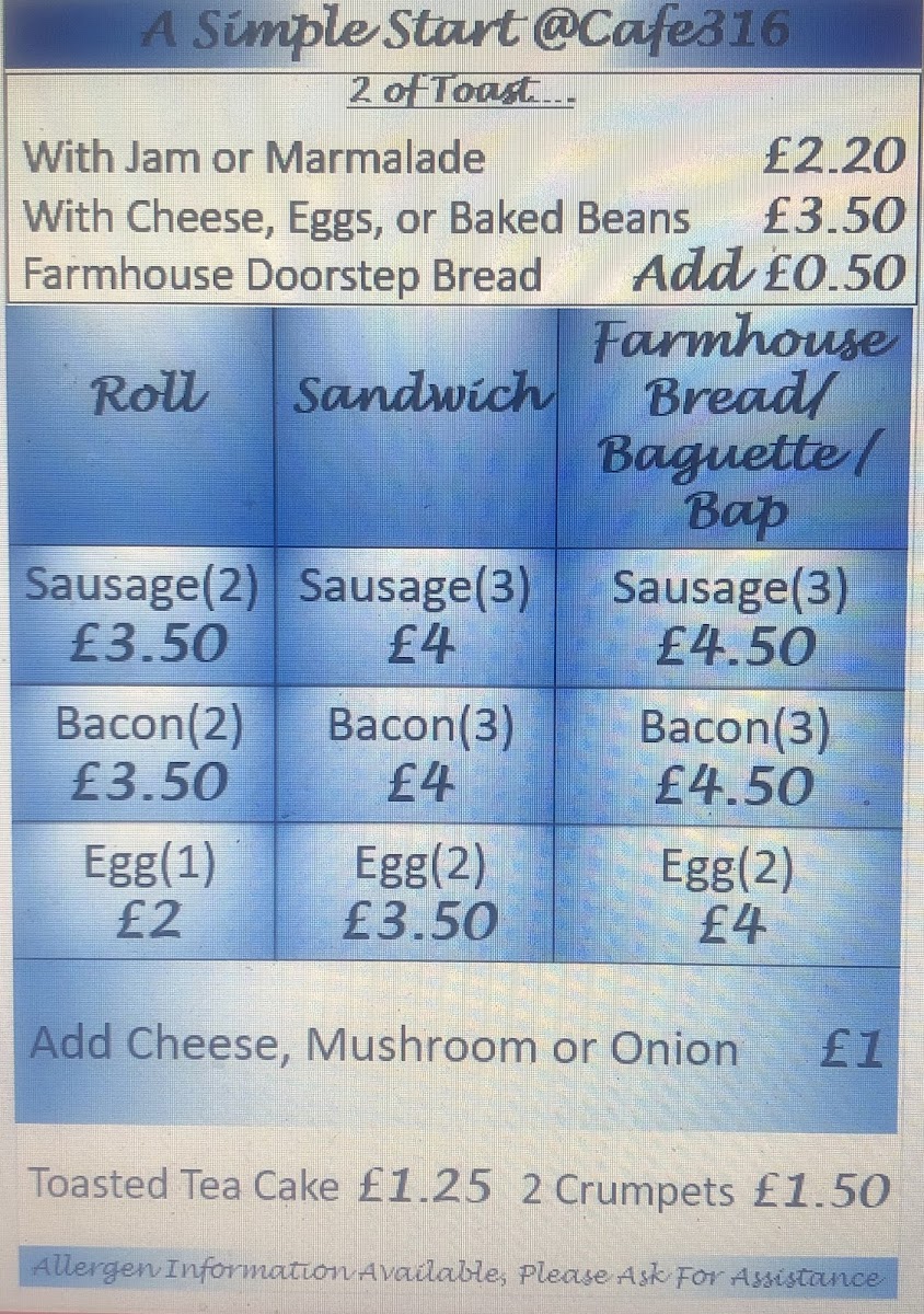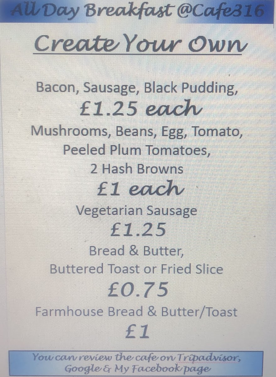 The dining atmosphere at Cafe316 is genuinely inviting. With friendly service and a laid-back vibe, many customers have described feeling like part of a family here. Tom, the chef and owner, is often seen greeting patrons with a warm smile and a personal touch. As one visitor, Fredi G, puts it, it truly feels like a "lovely little gem" in the community. Charlotte Walker echoed these sentiments, reminiscing about her father's beloved fry ups, and noted the attentiveness of the chef throughout her visit.