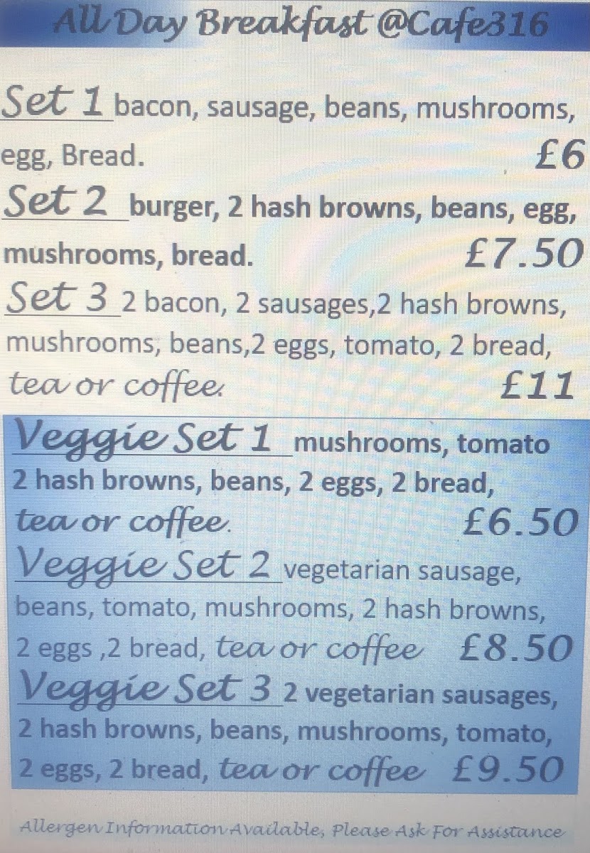 Welcome to Cafe316, a charming cafe tucked away at 316 London Rd, Westcliff-on-Sea. This delightful spot has quickly become the go-to destination for locals and visitors alike seeking a cozy atmosphere and delicious bites. With its welcoming decor and the aroma of freshly brewed coffee wafting through the air, Cafe316 is the perfect place to relax, recharge, and enjoy a hearty meal.